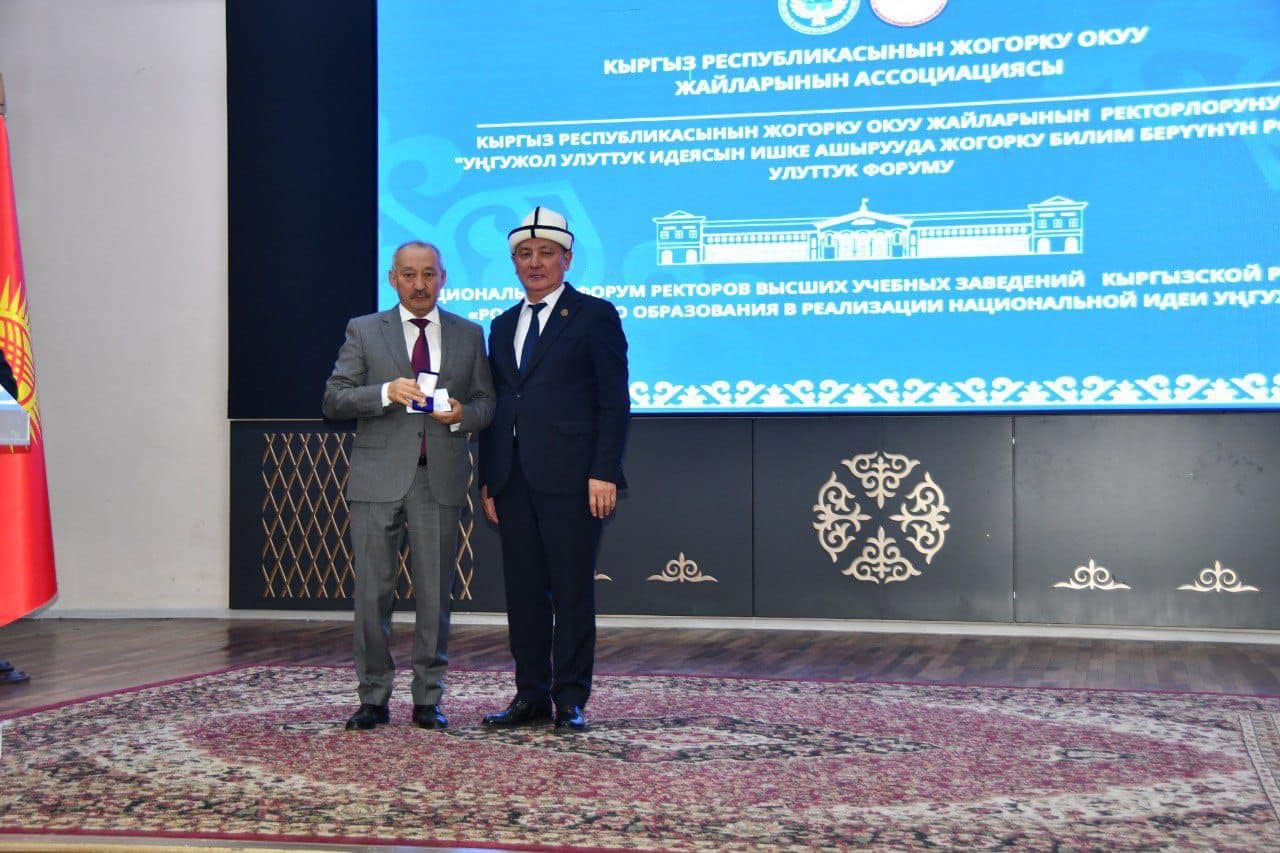В рамках форума Рысбек Зарылдыкович Нургазиев был награждён юбилейной медалью Кыргызского национального университета имени Ж. Баласагына, приуроченной к 100-летию со дня основания университета.