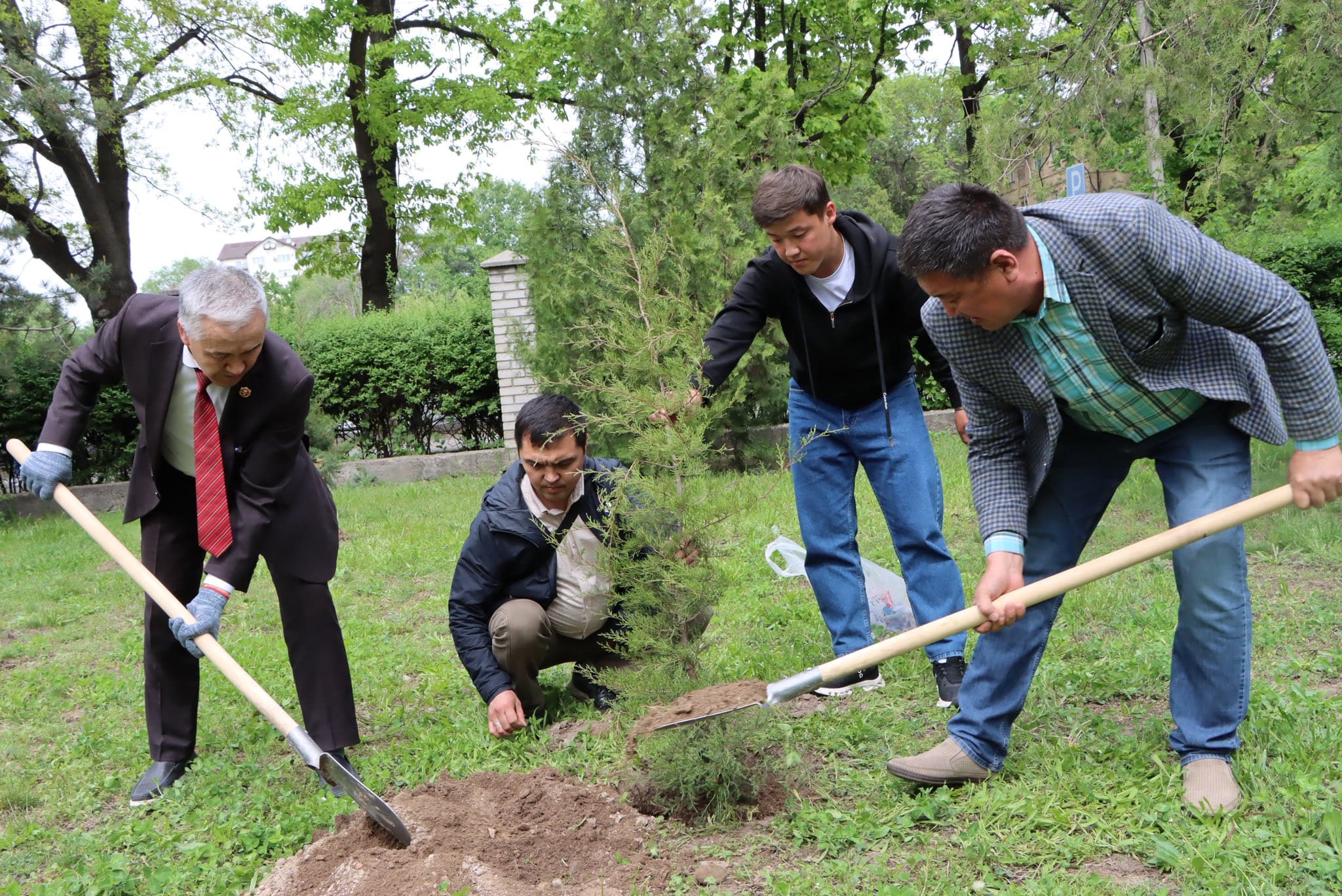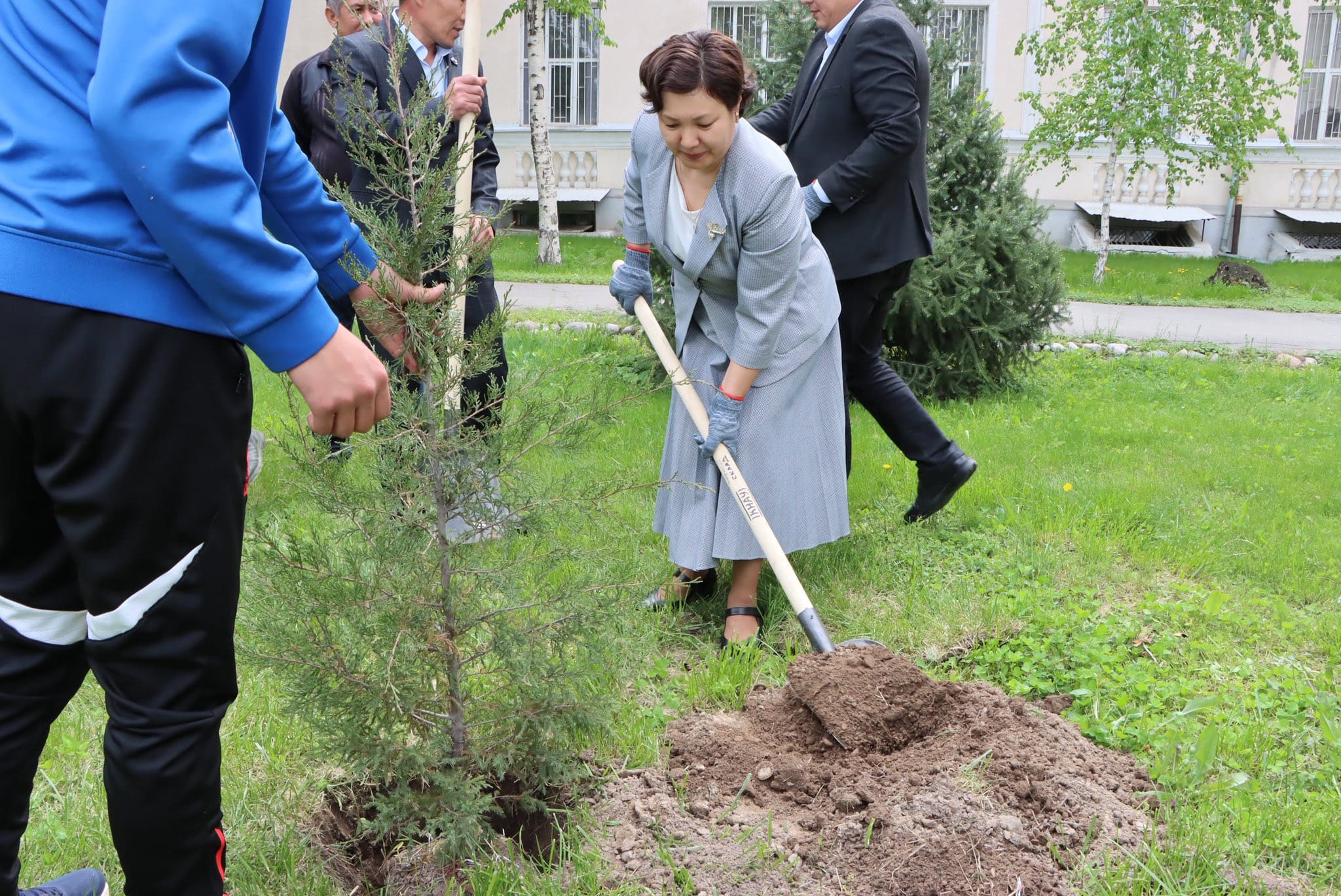В этот же день ректор Н.Э. Тотубаева совместно с проректорами, деканами, руководителями подразделений и преподавателями приняла участие в работах по озеленению территории университета. В рамках мероприятия были высажены саженцы, направленные на улучшение экологической среды и благоустройство кампуса.